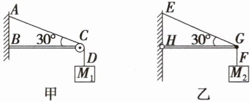 如图甲所示,细绳 AD 跨过固定的水平轻杆 BC 右端的定滑轮挂住一个质量为 $ M_1 $ 的物体,$ \angle ACB = 30^{\circ} $;图乙中轻杆 HG 的一端 H 用铰链固定在竖直墙上,另一端 G 通过细绳 EG 拉住,EG 与水平方向成 $ 30^{\circ} $ 角,在轻杆的 G 点用细绳 GF 拉住一个质量为 $ M_2 $ 的物体,重力加速度为 $ g $,求: