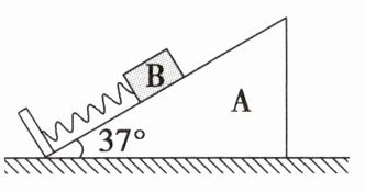 针对练 如图所示,斜面体 $A$ 放在水平地面上,平行于斜面的轻弹簧一端与物块 $B$ 相连,另一端固定在斜面底端的挡板上,弹簧处于压缩状态,压缩量 $x = 3$ cm,整个系统始终处于静止状态。已知斜面倾角为 $37^{\circ}$,物块 $B$ 质量 $M_{B} = 1$ kg,物块 $B$ 与斜面间动摩擦因数 $\mu = 0.5$,弹簧劲度系数 $k = 200$ N/m,$\sin 37^{\circ} = 0.6$,$\cos 37^{\circ} = 0.8$,$g = 10$ N/kg。则下列说法正确的是( )