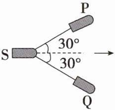 真题 3 (2024·湖北高考)如图所示,两拖船 $P$、$Q$ 拉着无动力货船 $S$ 一起在静水中沿图中虚线方向匀速前进,两根水平缆绳与虚线的夹角均保持为 $30^{\circ}$。假设水对三艘船在水平方向的作用力大小均为 $F_{f}$,方向与船的运动方向相反,则每艘拖船发动机提供的动力大小为( )