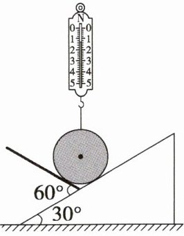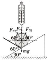 真题 2 (2024·河北高考)如图,弹簧测力计下端挂有一质量为 $0.20$ kg 的光滑均匀球体,球体静止于带有固定挡板的斜面上,斜面倾角为 $30^{\circ}$,挡板与斜面夹角为 $60^{\circ}$。若弹簧测力计位于竖直方向,读数为 $1.0$ N,$g$ 取 $10$ m/s²,挡板对球体支持力的大小为( )