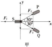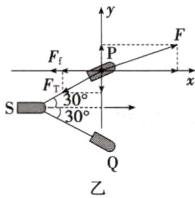 真题3 B 根据题意对S受力分析如图甲所示,正交分解可知$2F_T \cos 30° = F_f$,所以有$F_T = \frac{\sqrt{3}}{3} F_f$;对P受力分析如图乙所示,则有$(F_T \sin 30°)^2 + (F_f + F_T \cos 30°)^2 = F^2$,解得$F = \frac{\sqrt{21}}{3} F_f$。故选B。
