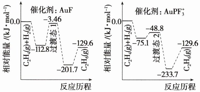 4.C 由题图可知,该反应为反应物总能量高于生成物总能量的放热反应,故A错误;由题图可知,过渡态1的相对能量高于过渡态2,物质的能量越高,越不稳定,所以过渡态1的稳定性小于过渡态2,故B错误;由题图可知,反应的焓变$ΔH=-[0-(-129.6kJ·mol^{-1})]=-129.6kJ·mol^{-1},$故C正确;由题图可知,使用催化剂AuF、催化剂$AuPF_3^+$时活化能分别为$109.34kJ·mol^{-1}、$$26.3kJ·mol^{-1},$则催化剂AuF相应的活化能大于催化剂$AuPF_3^+,$故D错误。