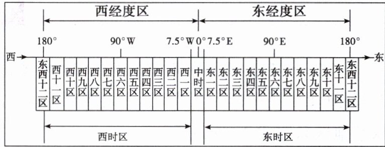 (2)由中时区向东为东时区,向西为西时区,每个时区跨经度为____。