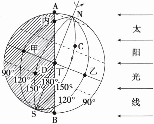 (3)计算:经度每隔1°,地方时相差4分钟,经度每隔15°,地方时相差1小时。图中甲与丁经度相隔60°,地方时相差4小时,按“东加西减”原则计算,此时丁地地方时为6时,则甲地为____时。