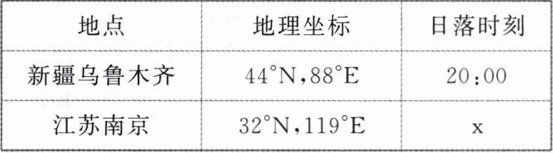 (2024·安徽黄山检测) 下表示意新疆乌鲁木齐与江苏南京两地地理坐标和某日日落时刻(北京时间)。据此完成 1~2 题。