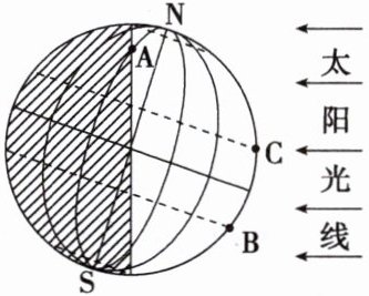 3.C 4.A 第3题,图中A地位于晨线上,此时正值日出。晨线和赤道的交点所在经线的地方时为6时,因此A地的地方时为4时,即A地在地方时4时日出,根据公式,昼长$=(12:00 - 日出时间) × 2$,即可求出A地的昼长为16小时,故选C。第4题,B、C两点分别在南、北回归线上,根据对称规律,B点昼长等于C点夜长,故C地昼长为13小时,故选A。