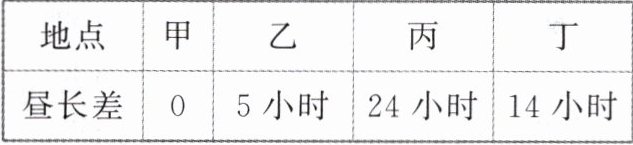 (2024·山东青岛阶段测试) 下表中所列的是一年中甲、乙、丙、丁四地的昼长差(即一年中昼长最大值 - 昼长最小值)。据此完成 3~4 题。