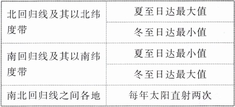 变化规律:①空间:正午太阳高度从太阳直射点所在纬线向南北两侧递减。②时间:直射点向本地所在纬线移来,则正午太阳高度增大,移去则减小。