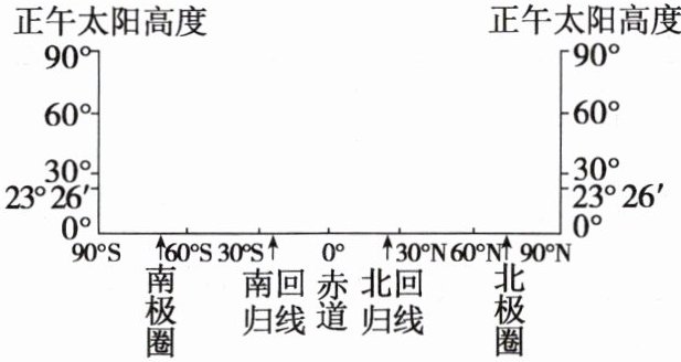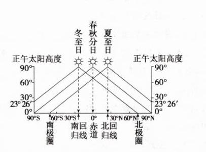[绘图] 在下图中画出北半球二分二至日的正午太阳高度空间变化曲线,并概括正午太阳高度的时空变化规律。