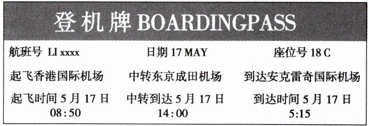 (2025·四川成都模拟预测)某著名登山家于2024年6月11日前后攀登北美第一高峰——阿拉斯加的迪纳利山,为此他提前预订相关机票从我国香港出发到达该州首府安克雷奇(西九区)。下图为该登山家此次登机牌信息示意图,图中时间均为当地的区时。据此完成5~6题。