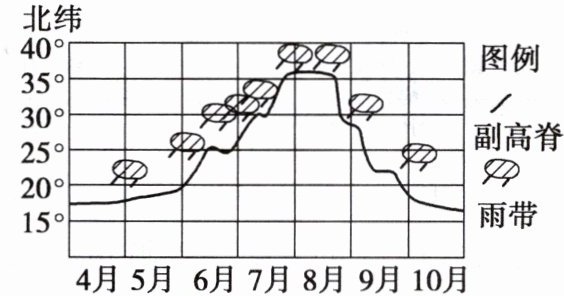 3.B 4.C 第3题,我国东部地区雨带带来的锋面雨,是由来自副高脊南侧的暖气团与从北方南下的冷气团相遇形成的锋面雨。 第4题,读图可知,副高脊位于30°N~35°N时为7月份,此时长江流域出现伏旱,东南沿海可能出现台风灾害。