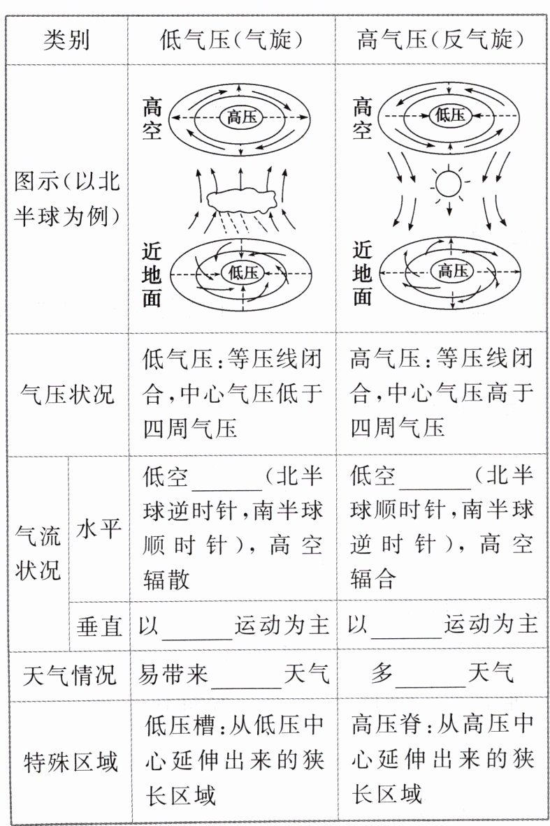 气旋:中心气流上升,水汽冷却凝结,易形成阴雨天气。