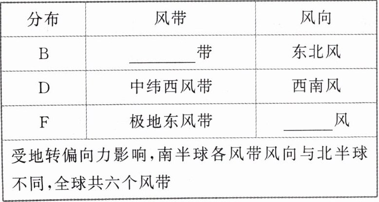 | 分布 | 风带 | 风向 |