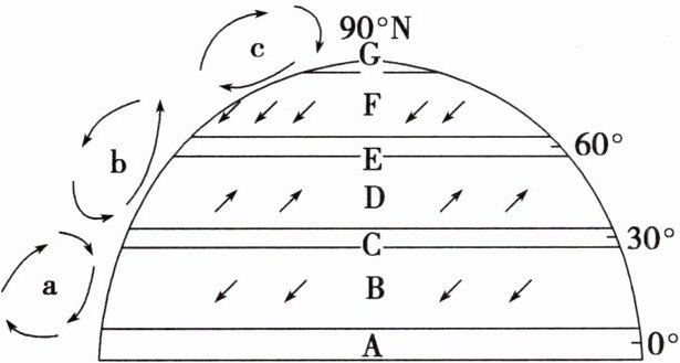 $\begin{cases}高、低纬度地区受热不均\\地转偏向力\end{cases}\Rightarrow三圈环流\begin{cases}a低纬度环流圈\\b中纬度环流圈\\c高纬度环流圈\end{cases}$
