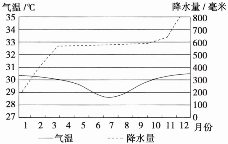 3.C 4.A 第3题,图中全年月平均气温在15℃以上,为热带;7月气温低于1月气温,位于南半球;由图中降水量逐月累计曲线可知,该地年降水总量在800mm左右,在10月到次年3月时间段内,降水量的累计值不断增长,而在4到9月,降水量的累计值增长很少,所以该地较为干燥的月份应为4到9月,6到8月尤为严重,降水几乎为0。说明该地降水有明显的季节变化,应为热带草原气候。南半球热带草原气候旱季受东南信风控制,湿季受赤道低气压带控制,C正确,A、B、D错误。故选C。第4题,结合上题分析,该地气候为热带草原气候。结合世界气候分布情况,可知澳大利亚西北部为热带草原气候,符合实际情况,A正确;尼罗河中游地区主要为热带沙漠气候,B错误;澳大利亚西南部为地中海气候,C错误;印度半岛西侧为热带季风气候,D错误。故选A。