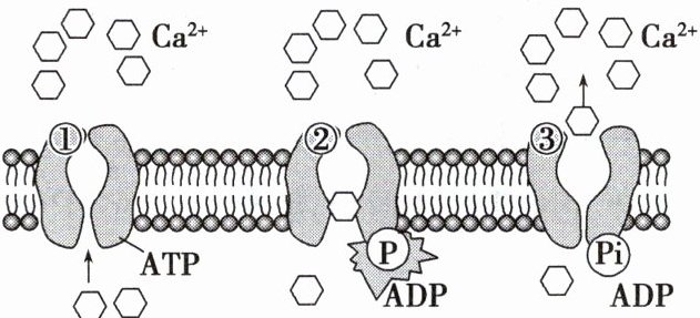 (1)ATP水解释放的磷酸基团使载体蛋白磷酸化,空间结构发生变化,活性也被改变,进而协助$Ca^{2+}$进行主动运输。