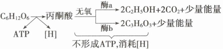 情境:苹果储存久了,会散发出酒精的味道。人在剧烈运动后上肢和下肢骨骼肌往往会产生酸痛的感觉。下图为无氧呼吸的类型和过程。据图回答有关问题:(考查科学思维)