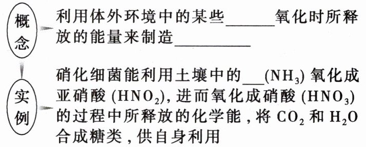 2. 化能合成作用概念:利用体外环境中的某些无机物氧化时所释放的能量来制造有机物;实例:硝化细菌能利用土壤中的氨${(NH_{3})}$氧化成亚硝酸${(HNO_{2})}$,进而氧化成硝酸${(HNO_{3})}$的过程中所释放的化学能,将${CO_{2}}$和${H_{2}O}$合成糖类,供自身利用。