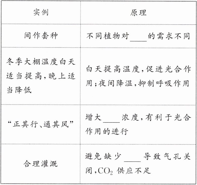 1. 间作套种:不同植物对光的需求不同;“正其行、通其风”:增大${CO_{2}}$浓度,有利于光合作用的进行;合理灌溉:避免缺少水导致气孔关闭,${CO_{2}}$供应不足。