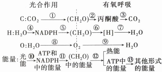 如图表示光合作用和有氧呼吸过程中C、H、O三种元素的转移途径以及能量转换过程。图中序号表示相关的生理过程。下列叙述错误的是( )