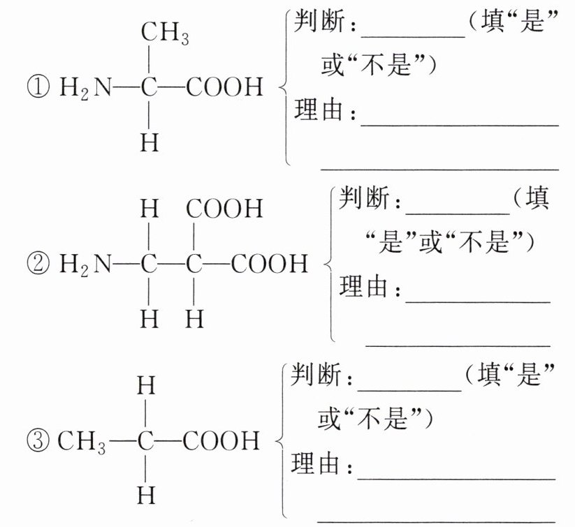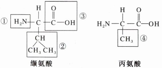 材料:氨基酸是组成蛋白质的基本单位,从蛋白质水解产物中分解出来的氨基酸有21种,下图为几种氨基酸的结构示意图,回答下列问题。