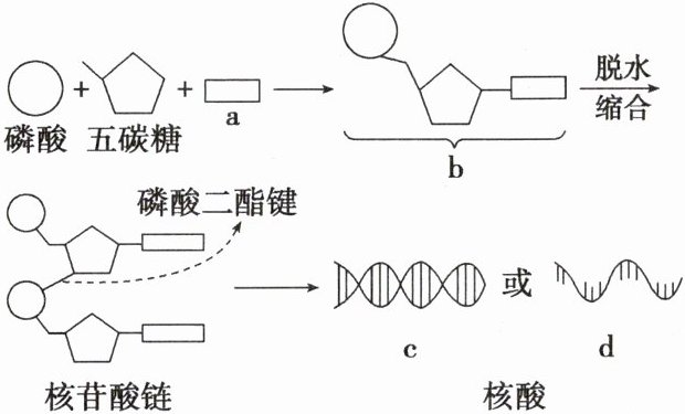 (1) 写出图中各字母代表的名称:a:含氮碱基,b:核苷酸,c:DNA,d:RNA。
