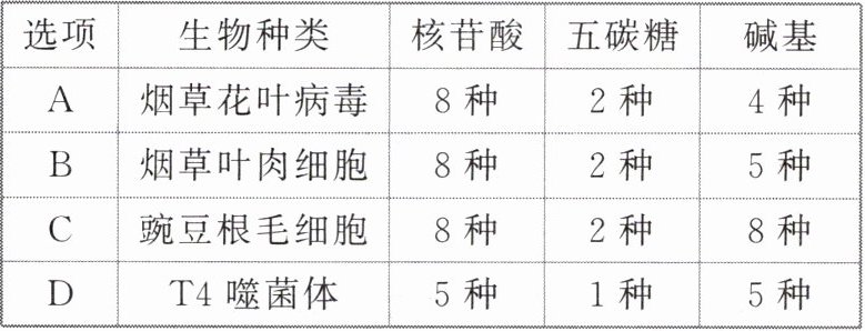 不同种类的生物所含核酸的种类有所不同。下列关于各个选项中生物的核苷酸、五碳糖、碱基种类的描述,正确的是( )