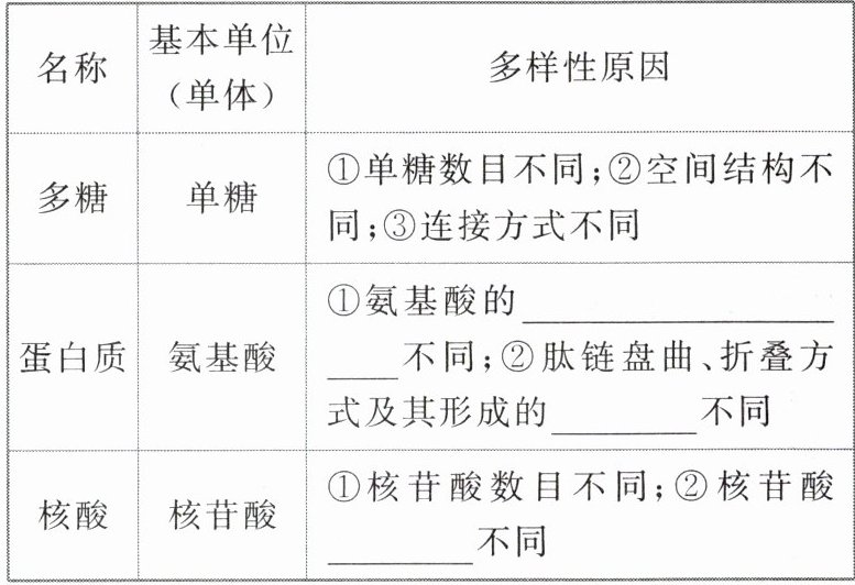 (4) 填表分析生物大分子的组成特点及多样性原因。