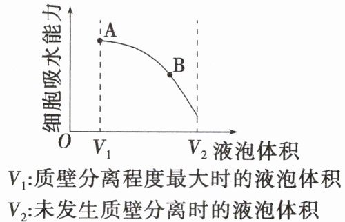 针对练4.D B点时,细胞处于失水状态,但未达到失水最多的程度,所以此时细胞液浓度依然小于外界溶液浓度,A错误;若适当增大外界溶液浓度,则外界溶液和细胞液间的浓度差增大,A点将向左上方移动,B错误;当液泡体积为V₁时,质壁分离的程度达到最大,此时细胞液浓度应等于外界溶液浓度,若细胞液浓度小于外界溶液浓度,则细胞会继续失水,C错误;随着细胞失水,细胞液浓度逐渐增大,导致细胞吸水能力逐渐增强,D正确。