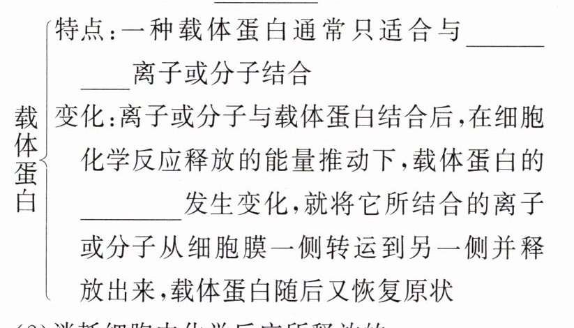 (1)离子或分子与载体蛋白结合后,载体蛋白的空间结构发生变化,运输完成后载体蛋白又恢复原状。