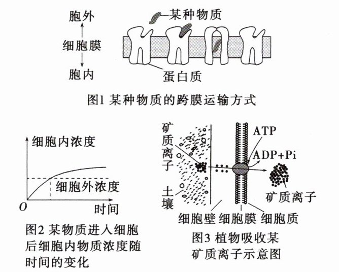 (3)图2中当细胞外浓度低于细胞内浓度时,随时间的推移,细胞内浓度还在逐步增加,说明该物质可以从低浓度一侧进入高浓度一侧,故该物质进入细胞的方式是主动运输。图3中矿质离子的跨膜运输有两个特点:一是逆浓度梯度,二是消耗ATP,故应为主动运输。