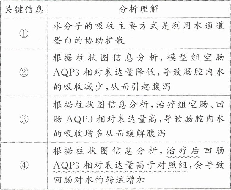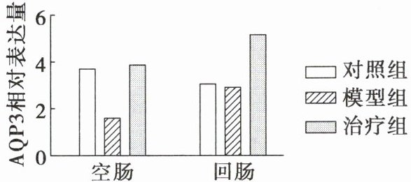 [思维流程] 水分子跨膜运输的主要方式是经过水通道蛋白的协助扩散,A错误;模型组空肠AQP3相对表达量降低,空肠黏膜细胞对肠腔内水的吸收减少,引起腹泻,B正确;治疗后空肠、回肠AQP3相对表达量提高,对水的转运增加,缓解腹泻,减少致病菌排放,C正确;治疗组回肠AQP3相对表达量高于对照组,可使回肠对水的转运增加,D正确。