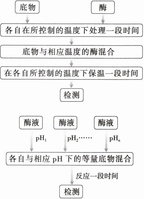 (2)探究温度对酶活性影响的实验中,应该先使酶和底物分别达到预设温度,然后再将底物和酶混合,否则会影响实验结果的准确性。淀粉遇碘液变蓝,因此实验一的步骤⑤最好选用碘液来检测单位时间内淀粉的剩余量,颜色越蓝,则单位时间内淀粉的剩余量越多,说明酶活性越低。
