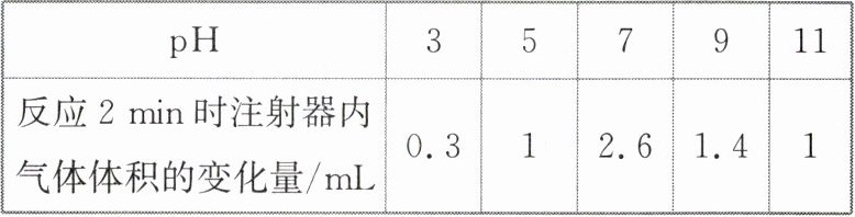 (2025·福州高三阶段练)某实验小组欲探究不同 pH 下过氧化氢酶的活性,进行了如下实验:将在不同 pH 缓冲液中浸泡过相同时间的大小、厚度及数量相同的土豆片,放入 5 个相同规格的注射器内,吸取过氧化氢溶液并封闭反应体系,记录初始读数。反应一段时间后,记录数据并计算注射器内气体体积的变化量,数据如表所示。下列叙述正确的是( )