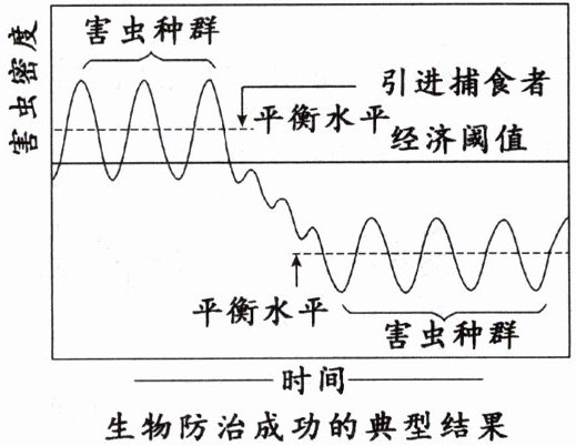 (2)思路:降低环境容纳量;具体措施:引进捕食者。该控制方法效果持久,降低有害生物环境容纳量是防治有害生物的根本措施。