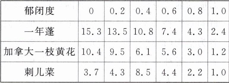 人工柳树林中,林下几种草本植物的种群密度(平均值,单位:株/m²)随林木郁闭度变化的调查数据如下表所示。