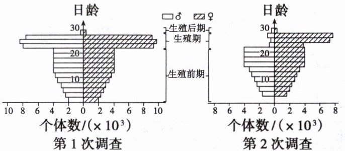 D 若昆虫种群受寒潮侵袭或遭杀虫剂消杀,则对各日龄阶段昆虫的消杀程度应一致,A、B错误;若昆虫种群被天敌捕杀,则应是低日龄阶段昆虫受影响较大,C错误;性引诱剂可以吸引交配期的雄性个体,进行诱杀,因此生殖期和生殖后期雄性昆虫数量变化较大,D正确。