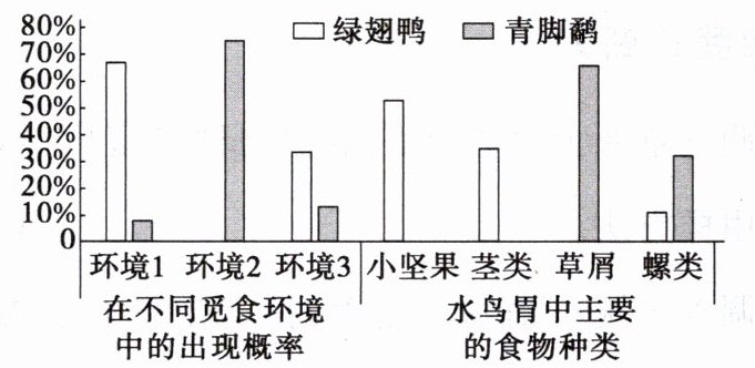 (3)以绿翅鸭为例,绿翅鸭以小坚果为主要食物,还吃茎类、螺类、贝壳沙砾等,绿头鸭也是,二者存在明显的种间竞争关系;绿翅鸭与鹤鹬、青脚鹬也有种间竞争关系,因为它们都捕食螺类,绿翅鸭与鹤鹬都吃贝壳沙砾。