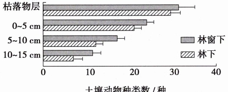 D 光照不仅影响森林生物群落的水平结构,还影响群落的垂直结构,A错误;由图可知,林窗下和林下土壤小动物的种类数均随深度的增加而减少,B错误;据图可知,林窗下和林下不同层次的土壤中小动物种类数不同,无法得知种群密度,0~5cm土层中小动物的丰富度通常最高,C错误,D正确。