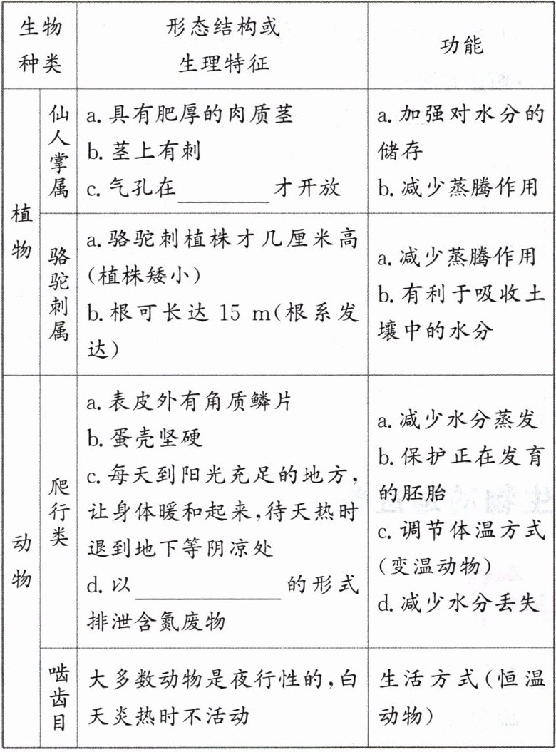(1)①干旱 ②少 ③耐旱 夜晚 固态尿酸盐