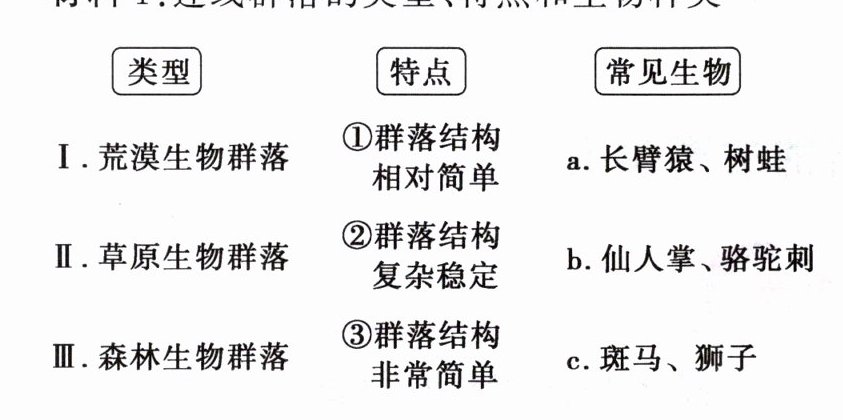 材料1:I—③—b II—①—c III—②—a 材料2:森林生物群落分布在湿润或较湿润的地区;草原生物群落主要分布在半干旱地区、不同年份或季节雨量不均匀的地区;荒漠生物群落分布在极度干旱地区。