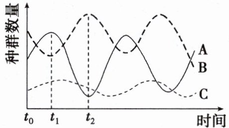 (3) 该生物群落中,A与B的种间关系是__________,原因是________________________。$t_0~t_1$的后期,A的种群数量增长减慢,最终停止增长,从种内和种间关系的角度分析原因是________________________。