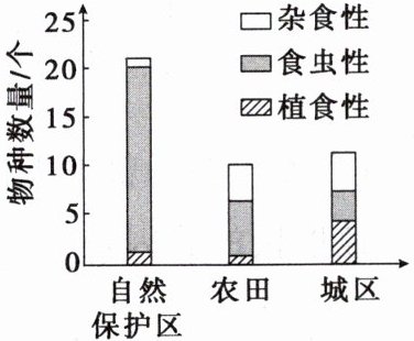 典例1(2024·广东卷)为探究人类活动对鸟类食性及物种多样性的影响,研究者调查了某地的自然保护区、农田和城区3种生境中雀形目鸟类的物种数量(取样的方法和条件一致),结果见上图。下列分析错误的是( )