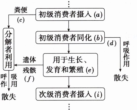 ③用于生长、发育和繁殖的能量=同化量-呼吸消耗量=流入下一营养级的能量+被分解者利用的能量(+未利用的能量),即e=b-d=i+f。