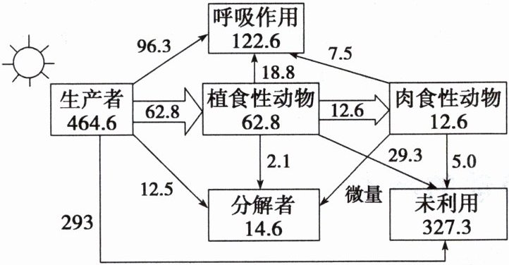 材料:生态学家林德曼对一个结构相对简单的天然湖泊——赛达伯格湖的能量流动进行了定量分析,得出了如下图所示的数据。(单位:$J· cm^{-2}· a^{-1}$)。
