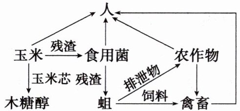 针对练4.B 用残渣来培育食用菌和蛆,提高了能量利用率,但不能提高能量传递效率,A错误;用玉米的副产品玉米芯生产木糖醇,可提高经济效益,B正确;生态系统的能量流动是单向的,不能循环利用,C错误;人工生态系统中人起到了决定性作用,离开人的管理,该生态系统不能正常运转,D错误。