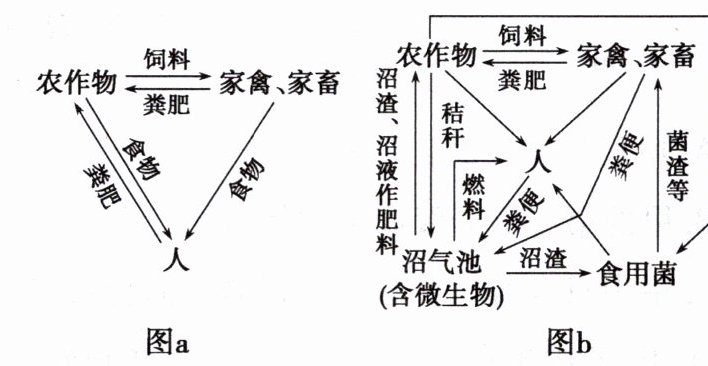 材料 2:下图是两个农业生态系统的模式图。图 a 中农作物为人类提供的食物、为家禽和家畜提供的饲料,都与图 b 相同。