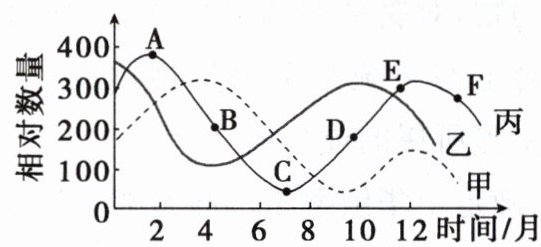 B.AC 段丙的种群数量下降一定是食物短缺造成的