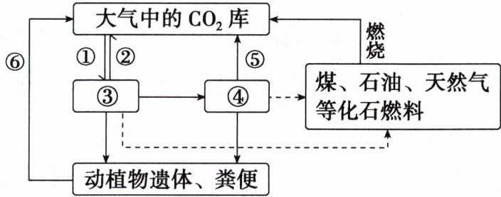 图中:①____和化能合成作用,②____,③生产者,④消费者,⑤呼吸作用,⑥____。