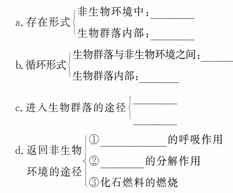 (2)①光合作用 ②呼吸作用 ⑥分解者的分解作用 a.CO₂和碳酸盐 含碳有机物 b.CO₂ 含碳有机物 c.光合作用 化能合成作用 d.①生产者、消费者 ②分解者